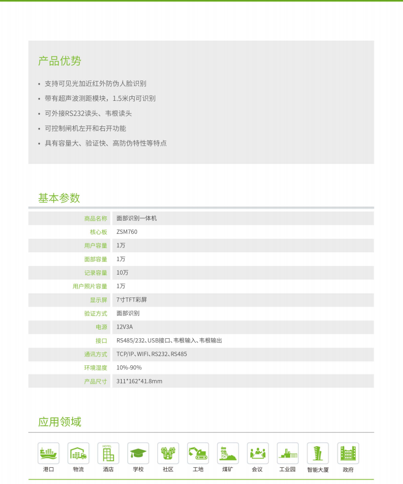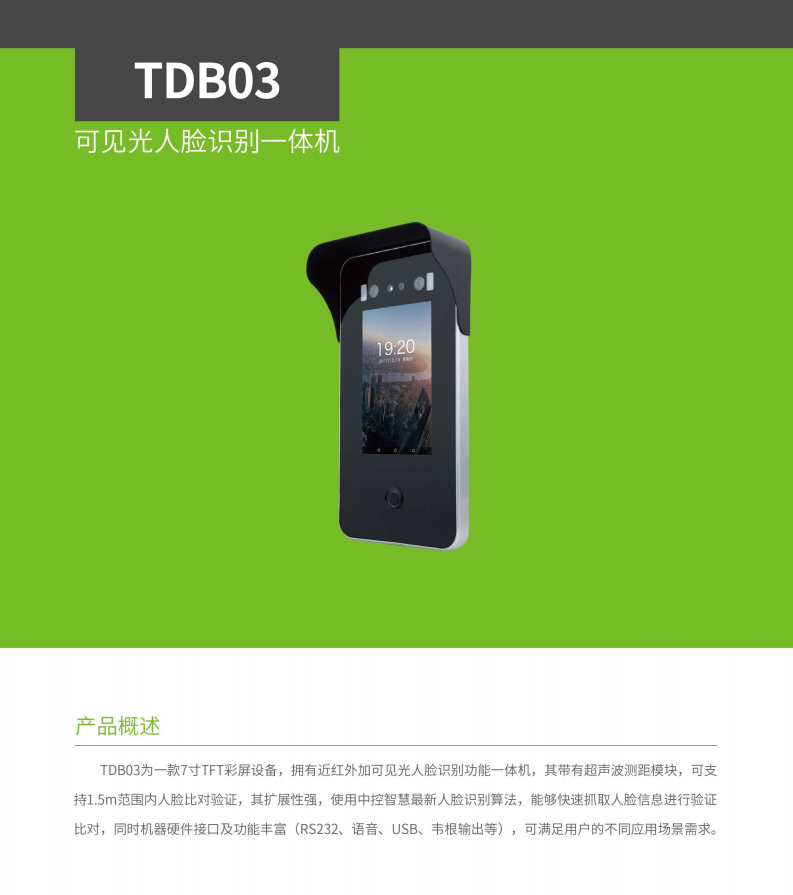 • 產品描述:TDB03為一款7寸TFT彩屏設備,擁有近紅外加可見光人臉識別功能一體機,其帶有超聲波測距模塊,可支持1.5m范圍內人臉比對驗證,其擴展性強,使用中控智慧最新人臉識別算法,能夠快速抓取人臉信息進行驗證比對,同時機器硬件接口及功能豐富(RS232、語音、USB、韋根輸出等),可滿足用戶的不同應用場景需求。