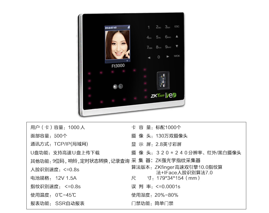 • 產(chǎn)品描述:ZKTeco熵基FT3000人臉識別考勤門禁一體機